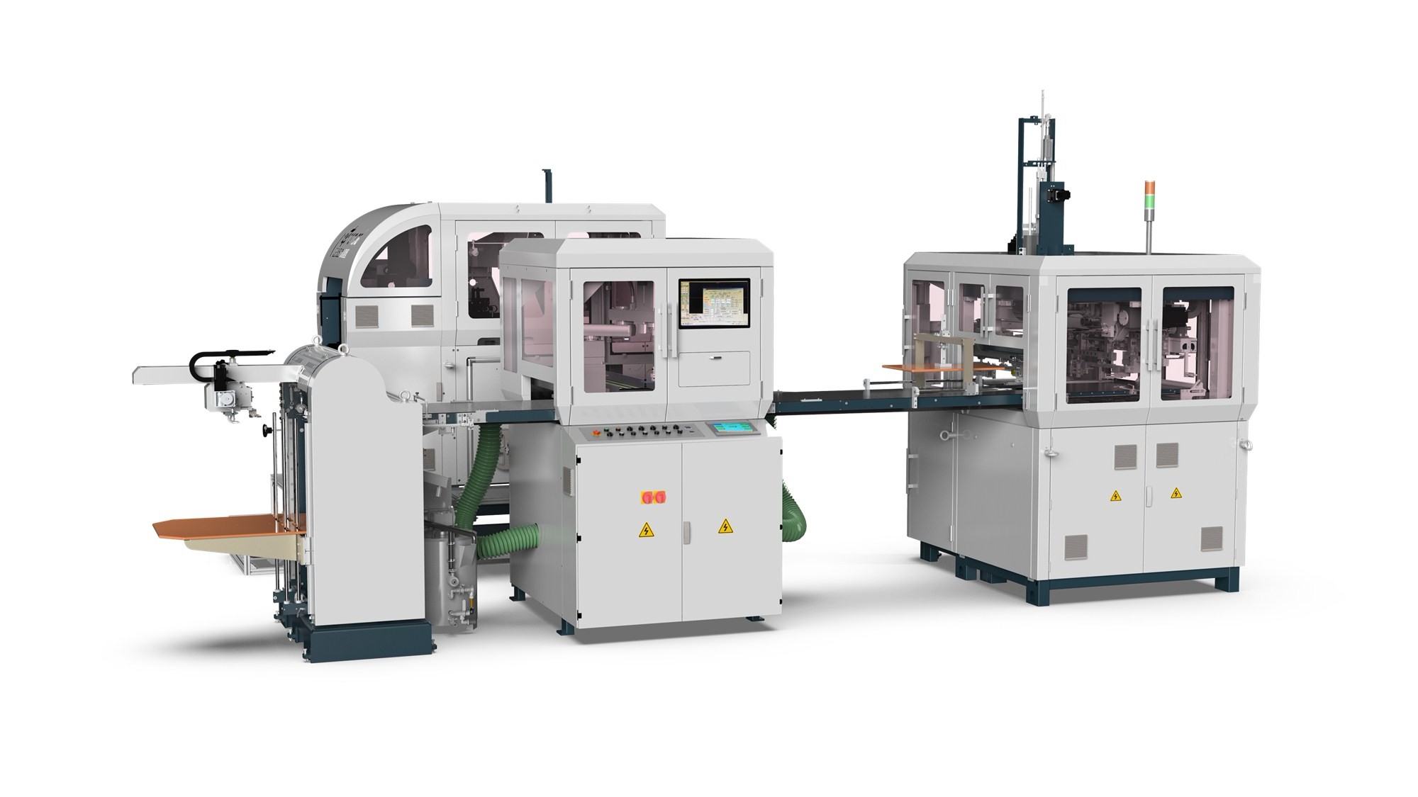 在飞达、过胶和输送带使用知名品牌伺服驱动,可无级变速,高精度,易调节,省时间;贴角部分,定位部分采用图像定位系统及机器人抓取部件,提高定位精度及效率,误差范围可达±0.05mm,且定位及调试速度更快;成型机采用THK线性导轨及虚拟电子凸轮驱动,更稳定耐磨且动作更流畅,折入深度及折耳长度尺寸范围更大。